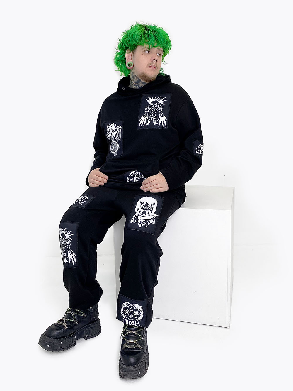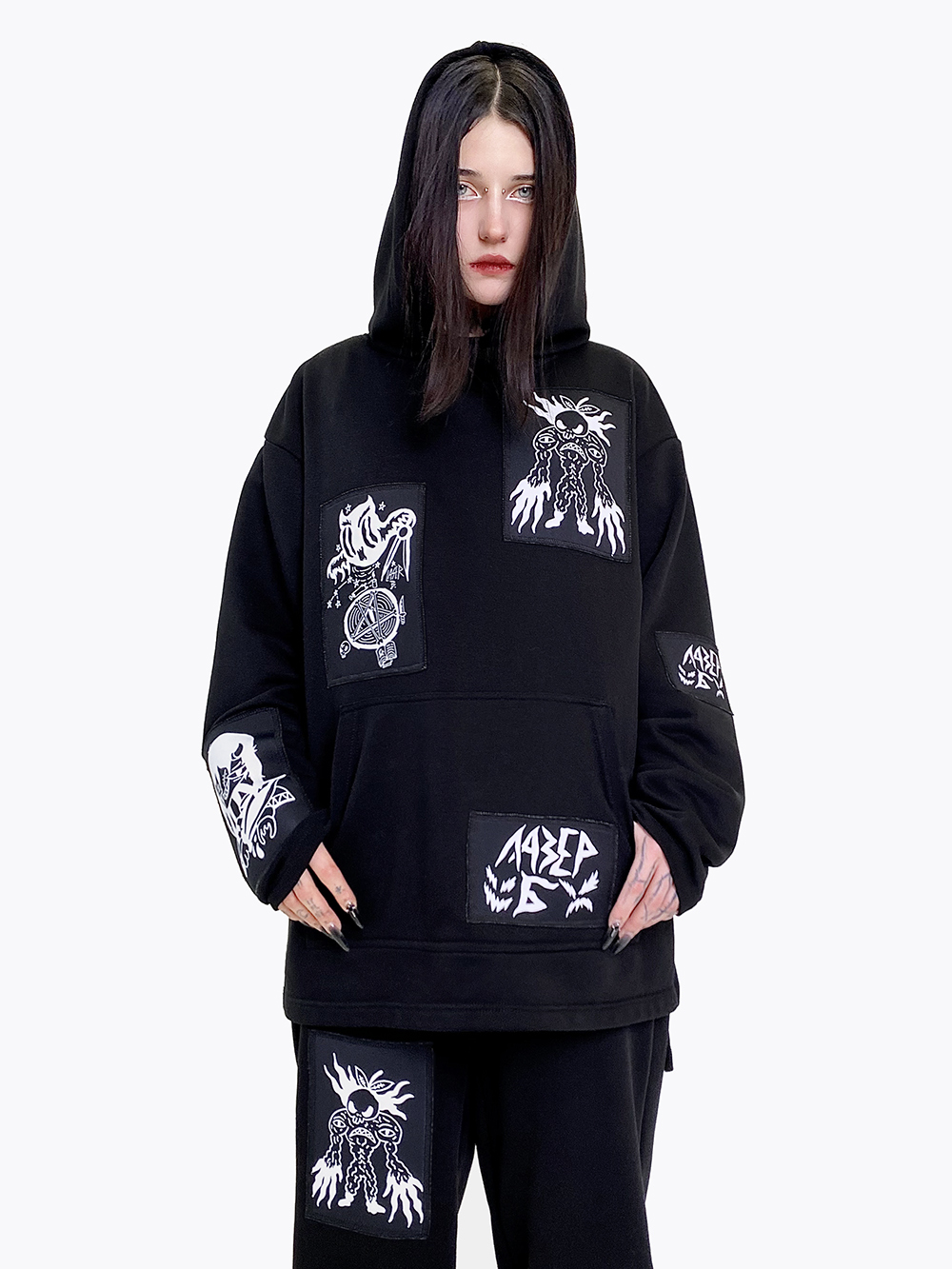Unisex. Free straight cut. Overhead pocket in the front, side cuts. Print on the back, chest, hood and sleeve. Printing: Thermal Transfer Materials: 80% cotton, 20% polyester