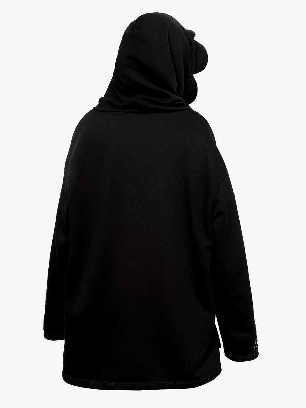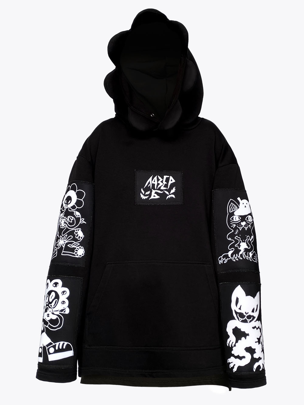Unisex. Free straight cut. Overhead pocket in the front, side cuts. Print on the back, chest, hood and sleeve. Printing: Thermal Transfer Materials: 80% cotton, 20% polyester