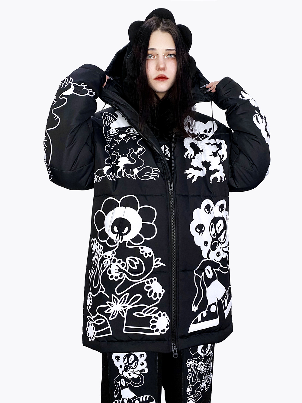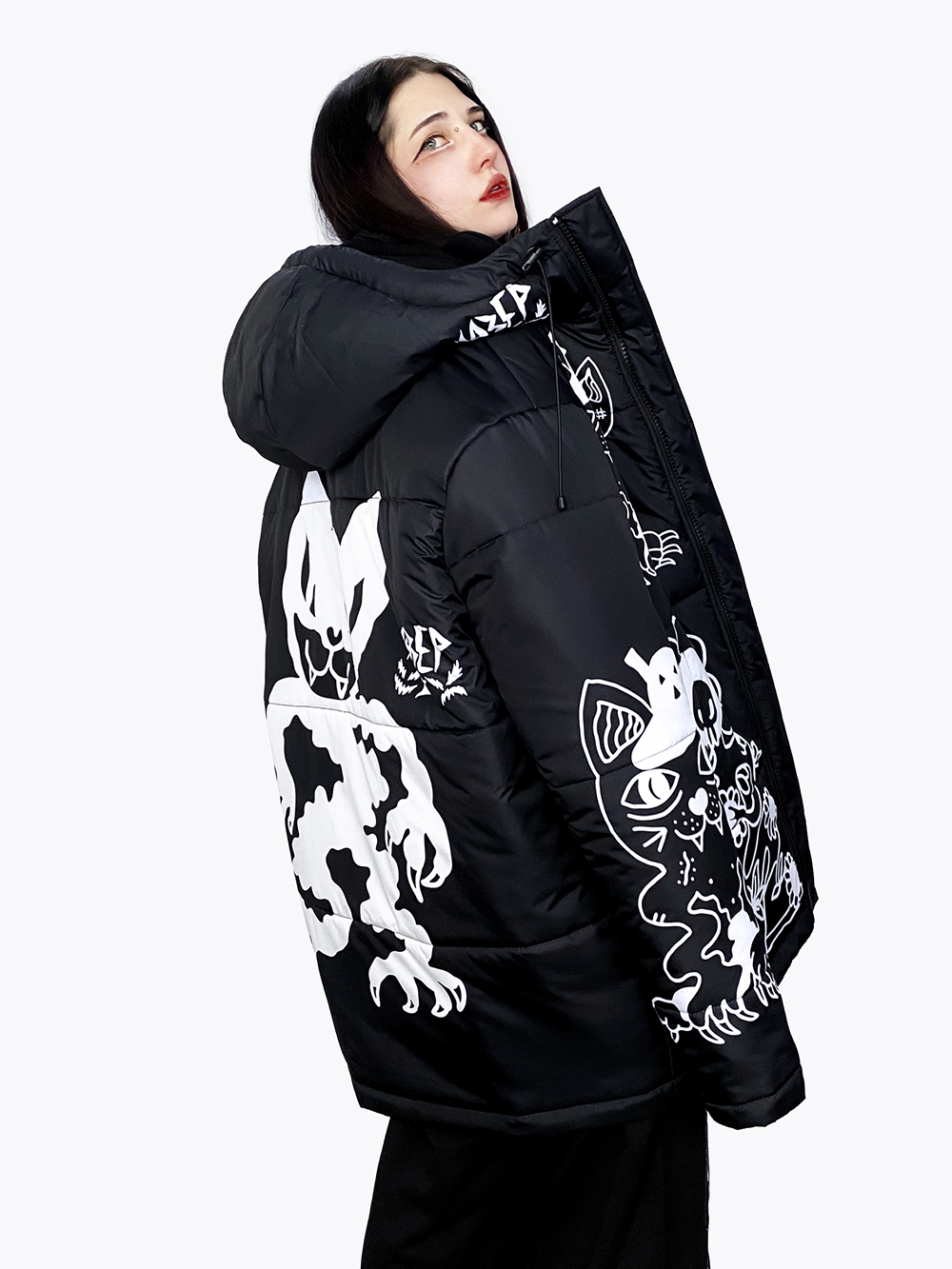 Запринтованный пуховик с двойным слоем утеплителя. Водоотталкивающая ткань.